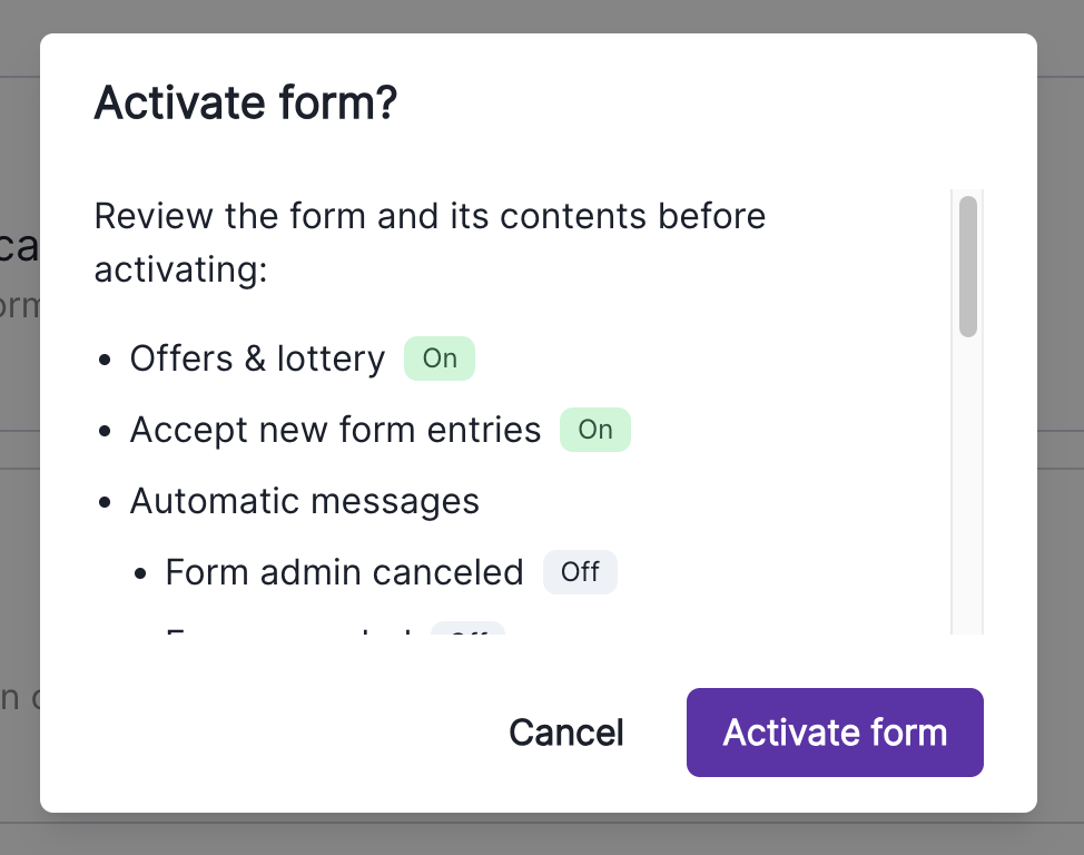 2. Review and confirm whenever you're activating a form that was previously inactive - you'll be able to see a summary of its settings before you do so: