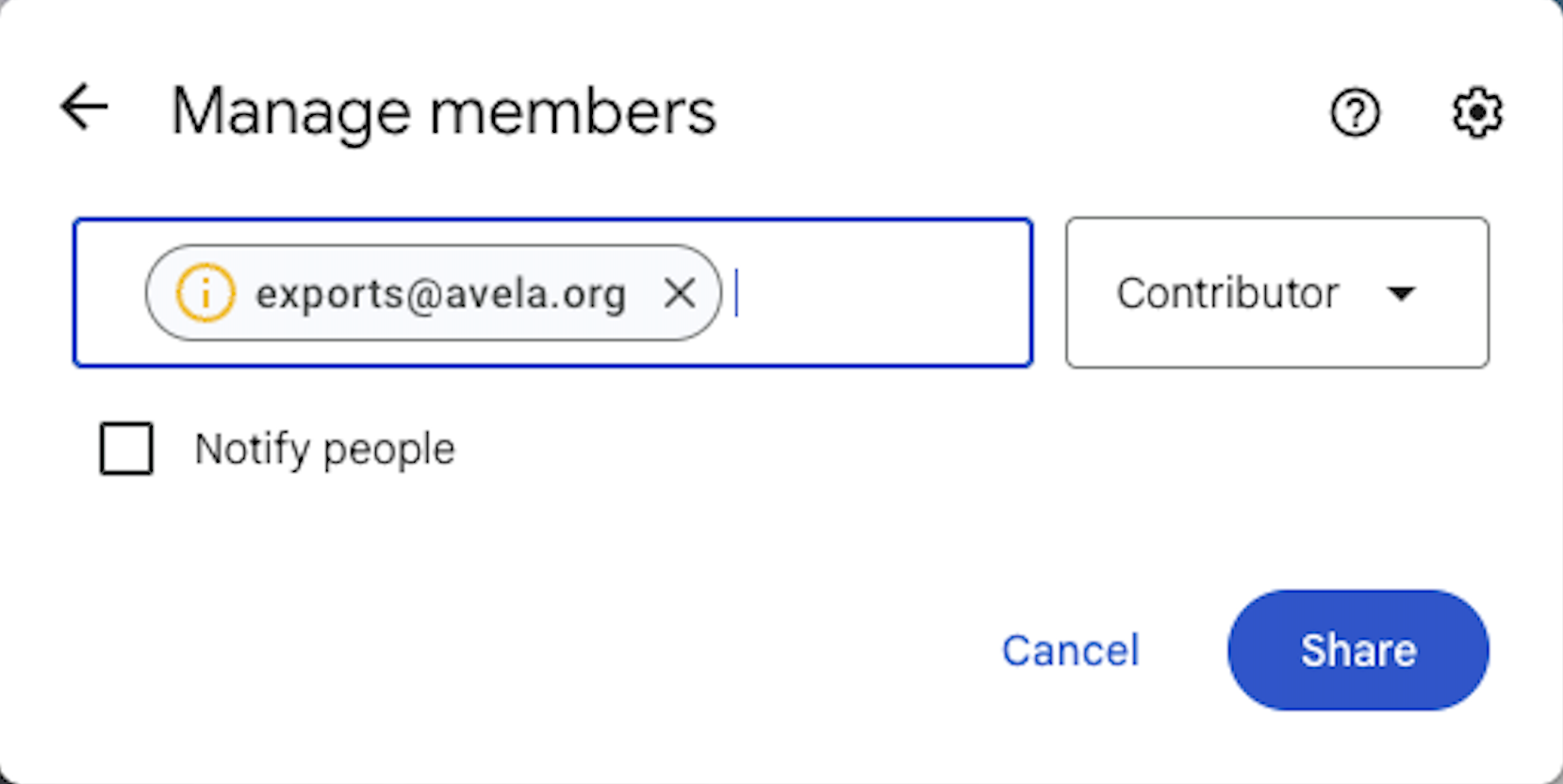 - To export to Google drive as a new Google Spreadsheet, the destination needs to be within a Shared Drive of your Google Workspace, and you'll first need to share the drive with our service account exports@avela.org, as a Contributor.