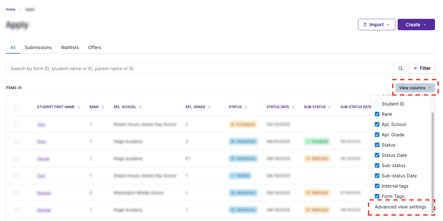 In any form list you have access to, click on View columns. You'll have a set of shortcut columns to pick from, as well as Advanced view settings. Use Advanced view settings to customize more specific columns, like specific questions in your form, or particular student or guardian data.