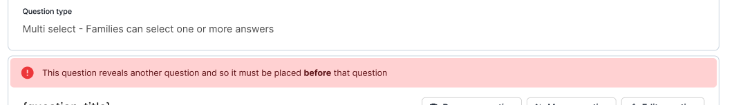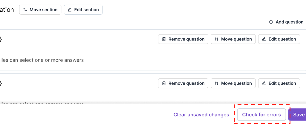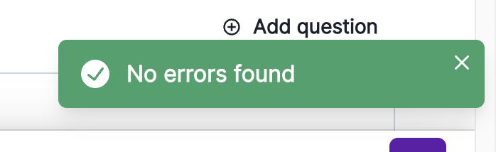 - If it is red, it will read the amount of errors found. That's ok! Each error will be highlighted in the place it is at - a section or a question - so it is easy for you to spot and learn how to fix it. Errors are typically related to sections or questions being in the wrong order for your logic to work properly, or unique sections or questions that are asked more than once.