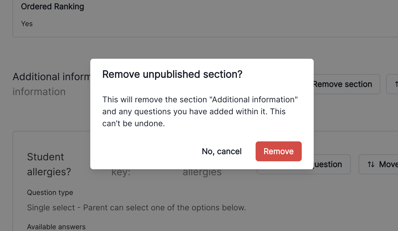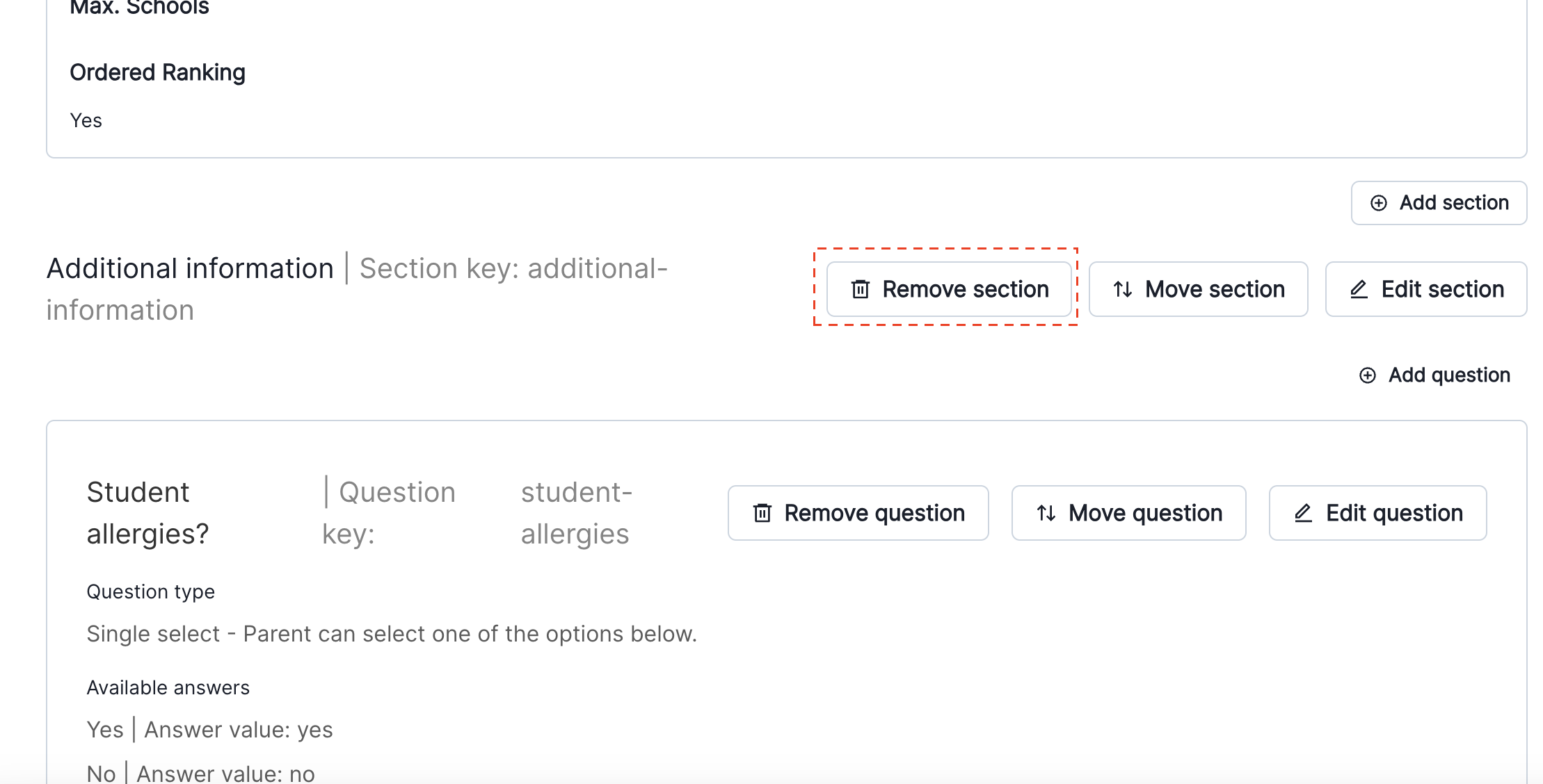 Sections you no longer want to have on the form can be quickly removed when in draft mode. Removing a section removes any questions within it as well, so you don't need to individually get rid of them before removing a section.