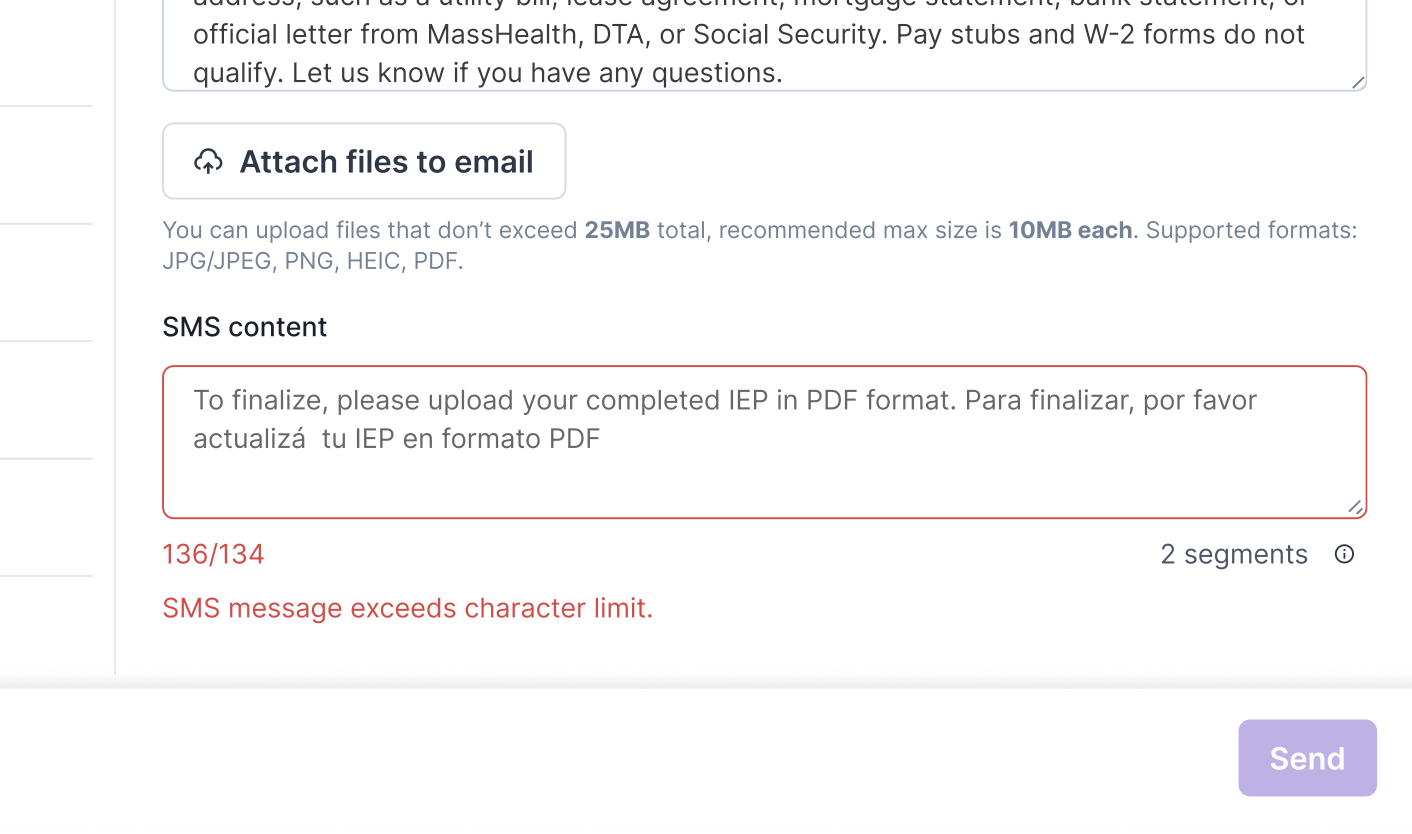 Avela supports up to two segments per SMS message, whether sent as an automatic message triggered by a form or as an ad-hoc message sent manually to a group of families.
