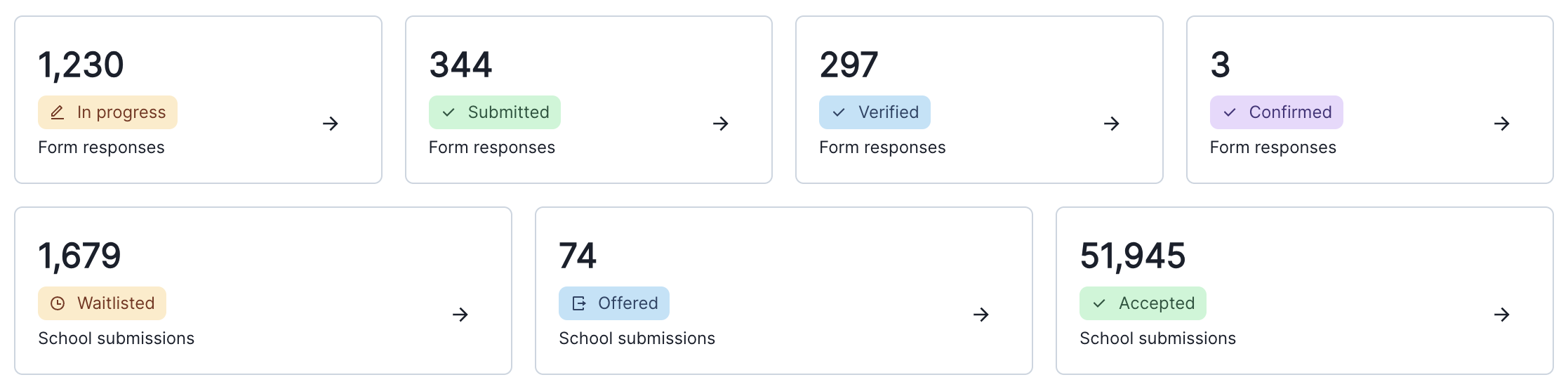 At the very top of the page, you'll see a row of cards that give you a quick funnel view of how form responses are progressing through the enrollment process. These cards show counts for statuses like:
