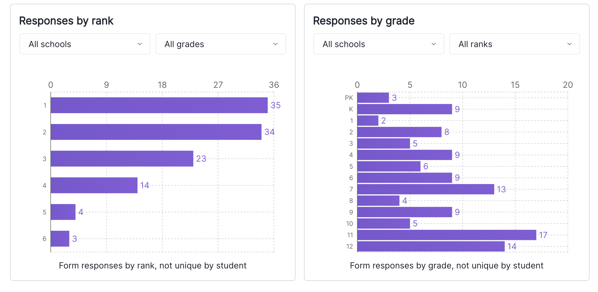 This horizontal bar chart shows how many form responses exist at each rank (1 through 10), helping you understand how families are prioritizing schools in their applications.