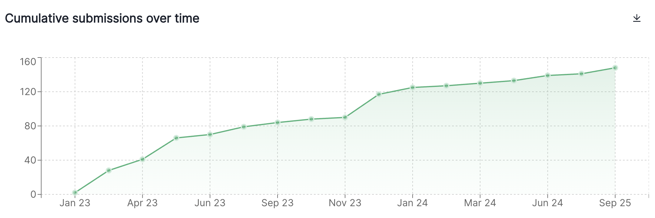 This chart plots the number of form submissions over time using the date each response was last submitted, accumulating the numbers over time. The x-axis shows dates and the y-axis shows the count of responses. It helps you spot trends, peak submission periods, and whether submissions are on track.